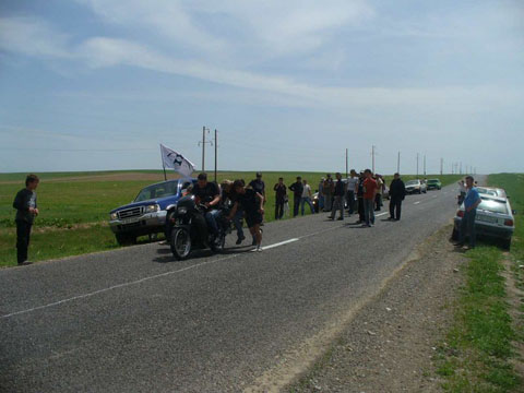 Звоним Марату Varadero - президенту чимкентского клуба байк-анархистов "Адреналин". Пробиваем у него маршрут через город на выезд в Алма-Ату, поняв, что на массовую покатуху по Шымкентским улицам мы уже опоздали... Марат говорит, что подсыпется к нам по дороге и мы въезжаем в Шымкент - улицы праздничные, чистые, светлые, украшенные какими-то буддийскими флажками-гирляндами. Медленно, по-чопперному, прошиваем город насквозь. Плетемся.... Уже на подъезде к выездному кольцу "налево пойдешь - в Ташкент попадешь! направо пойдешь - в Алма-Ату приедешь!" мы обнаруживаем где-то пятьдесят разномастных и разношерстных мотоциклов и их владельцев, а также кучку сочувствующей братвы на тачках!