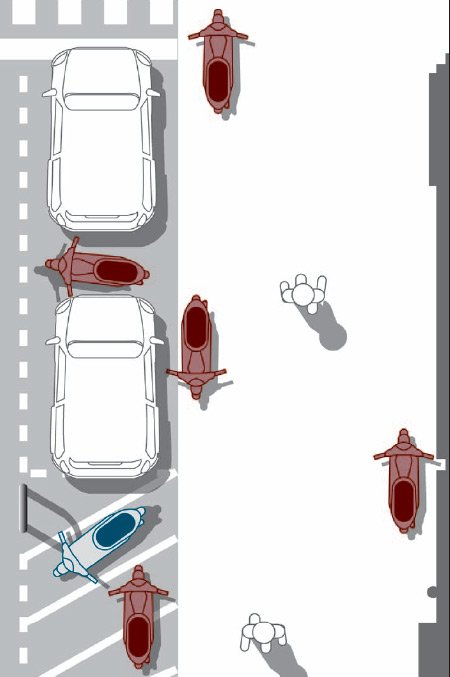 – если вам приходится припарковаться на тротуаре, постарайтесь сделать так, чтобы ваш мотоцикл не мешал пешеходам, а именно не оставляйте свое транспортное средство близко к бордюрам или фасадам зданий.