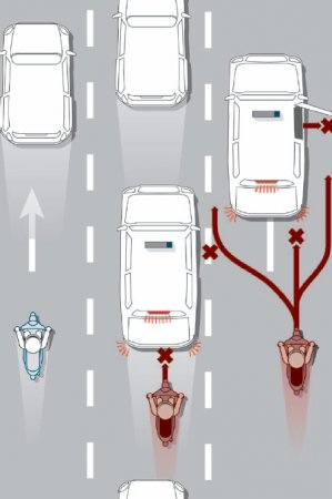 С такси нужно быть также осторожными, как и с автобусами. Когда машина такси стоит у правого края дороги, без сомнения, пассажир либо выходит из машины, либо только садится в нее. Поэтому не стоит пытаться объехать машину справа (между машиной и бордюром) потому, что внезапно пешеход окажется на вашем пути. С другой стороны, если такси едет медленно в крайнем правом ряду, велика вероятность того, что оно внезапно остановится, когда пассажир решит выйти или, если такси пустое, его кто-нибудь остановит. В обоих случаях, если ситуация на дороге не позволяет вам перестроиться и вы вынуждены следовать за машиной такси, держите большую дистанцию и будьте готовы к тому, что машина вдруг остановится, чтобы это не стало для вас сюрпризом. Запомните правило номер один при езде на мотоцикле: никогда не подъезжайте вплотную к впереди идущей машине.